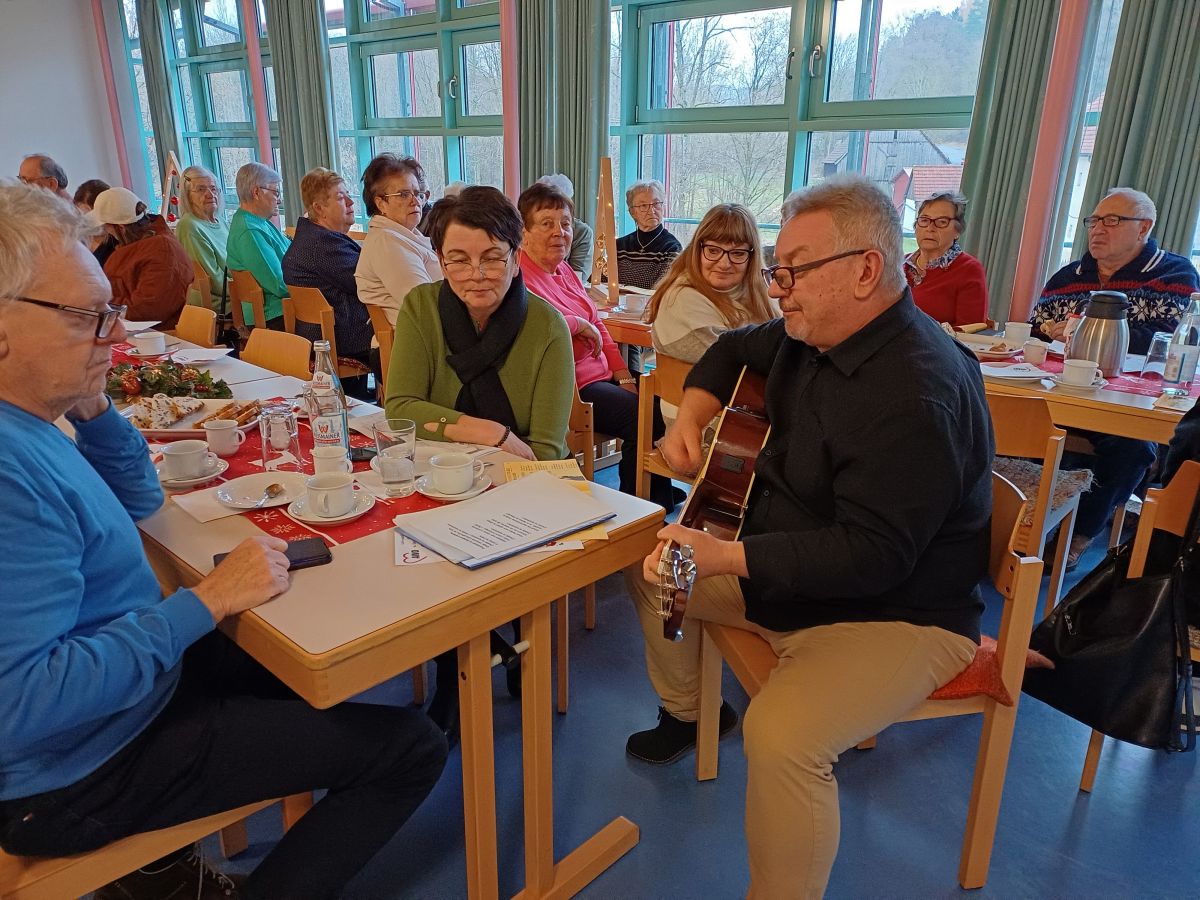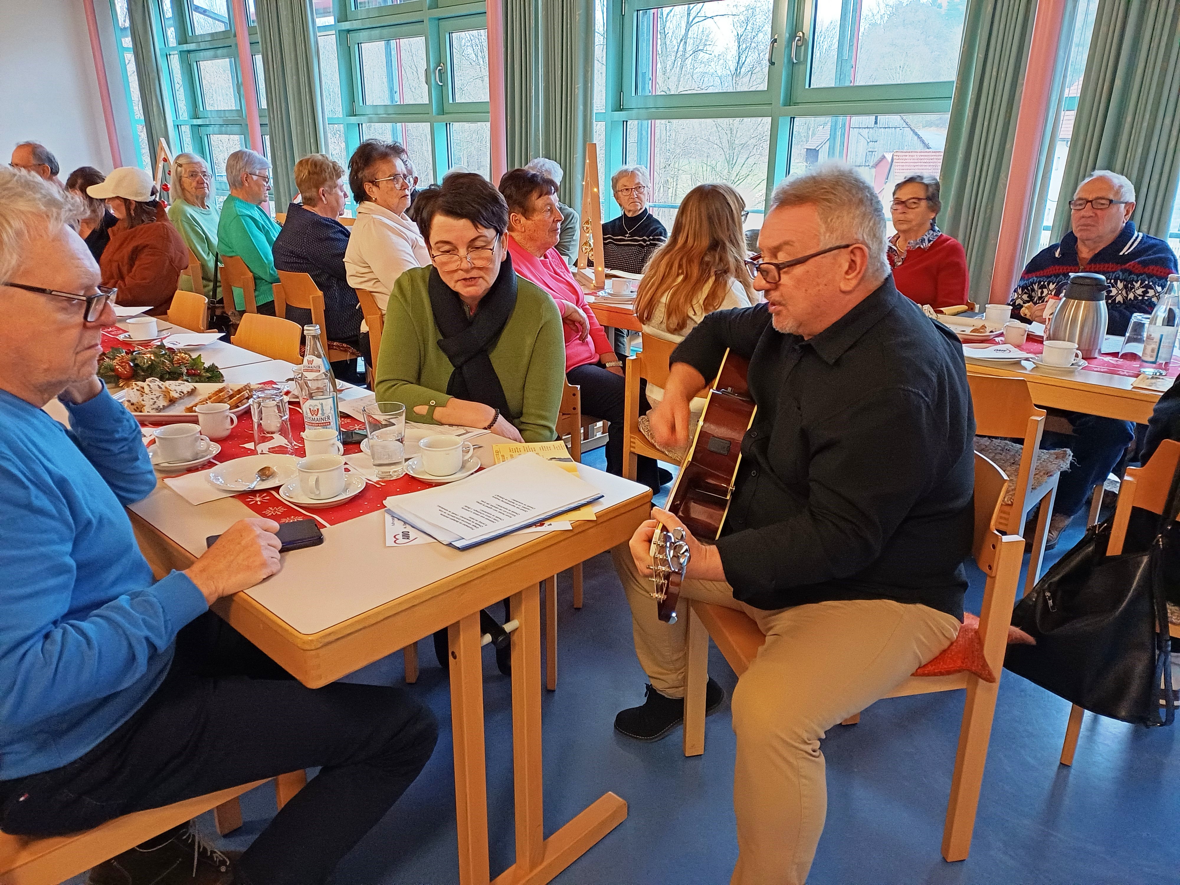 Mit dem Lied „Feliz Navidad“ eröffnet und weiterhin weihnachtlich-musikalisch umrahmt wurde die Feier von Adalbert, der mit seiner unverwechselbaren Stimme und seinem Gitarrenspiel begeisterte und die Anwesenden zum gemeinsamen Singen altbekannter Advents- und Weihnachtslieder ermunterte.