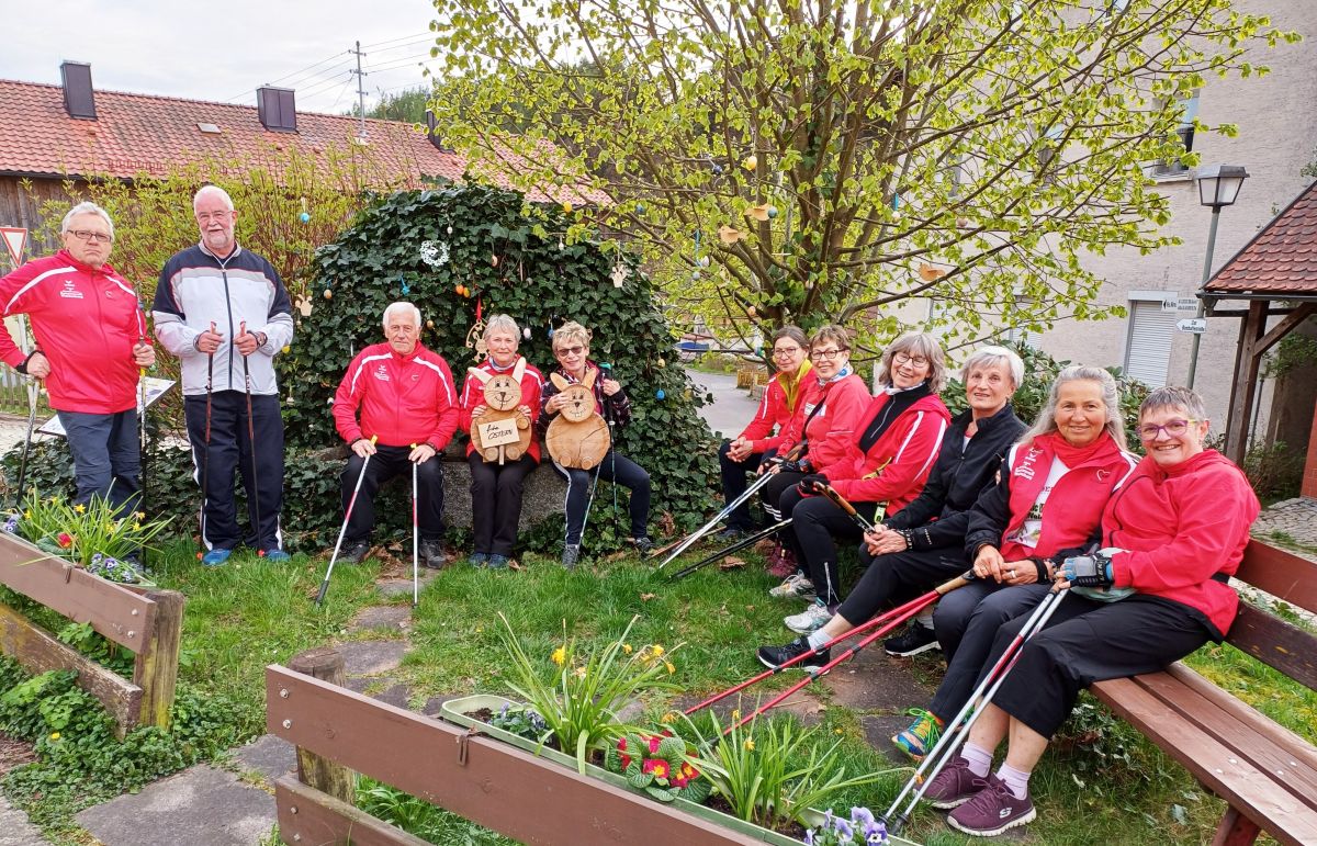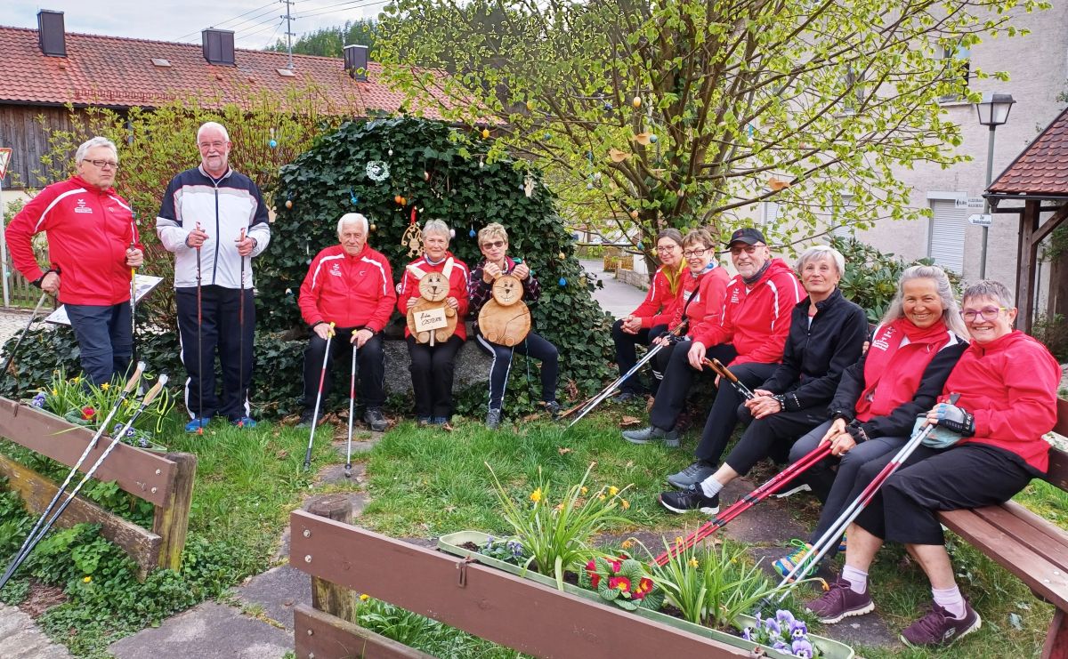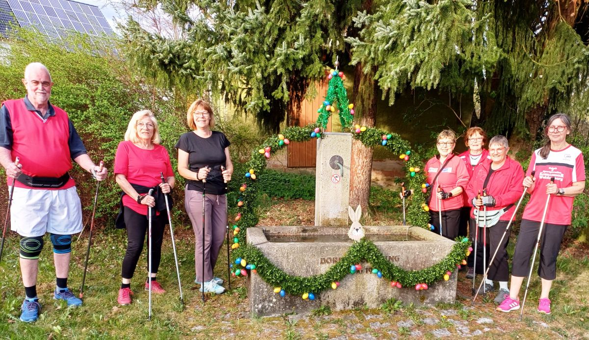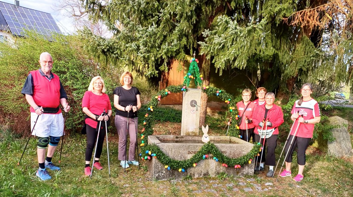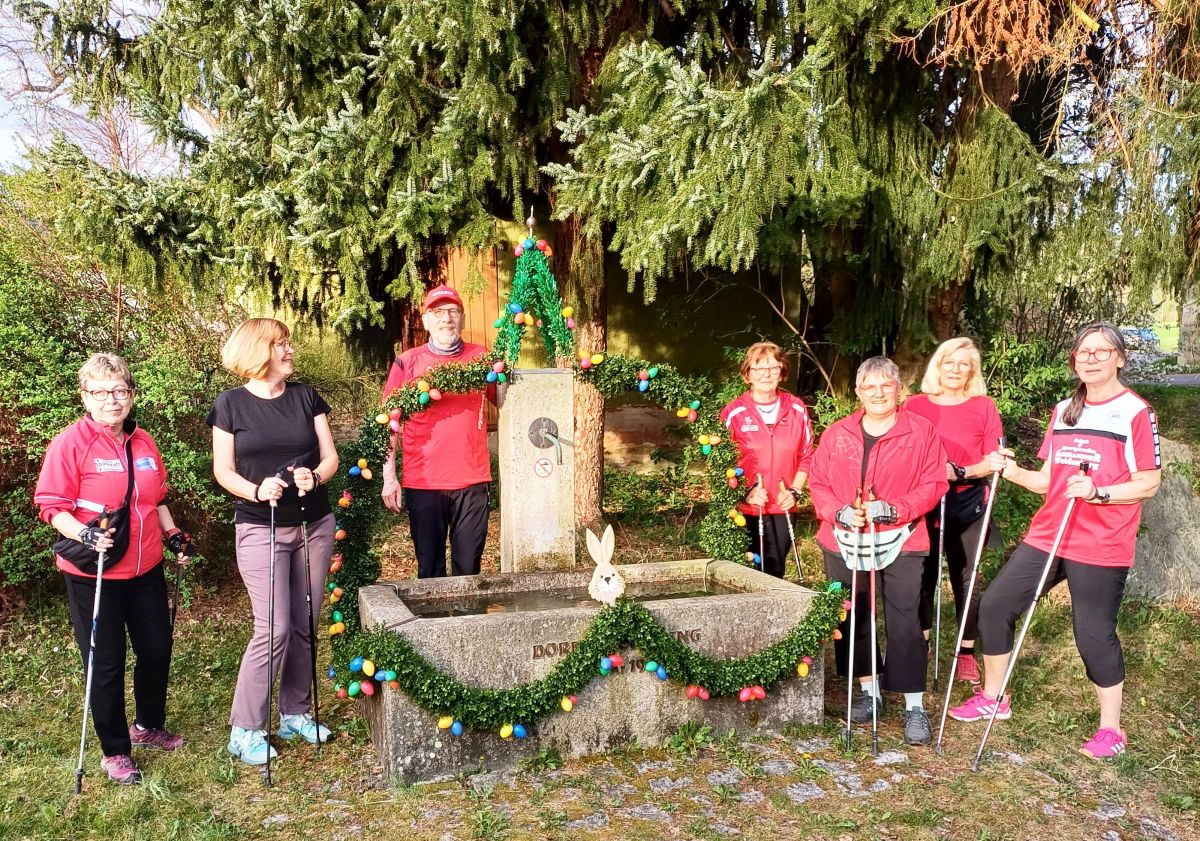 Der Osterlauf 2025 führte die Nordic Walking Freunde dieses Jahr zum österlich geschmückten Brunnen in Mengersreuth.