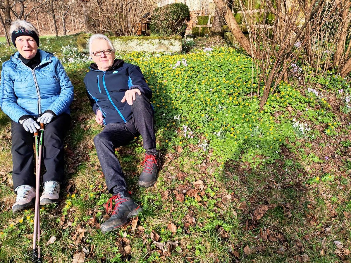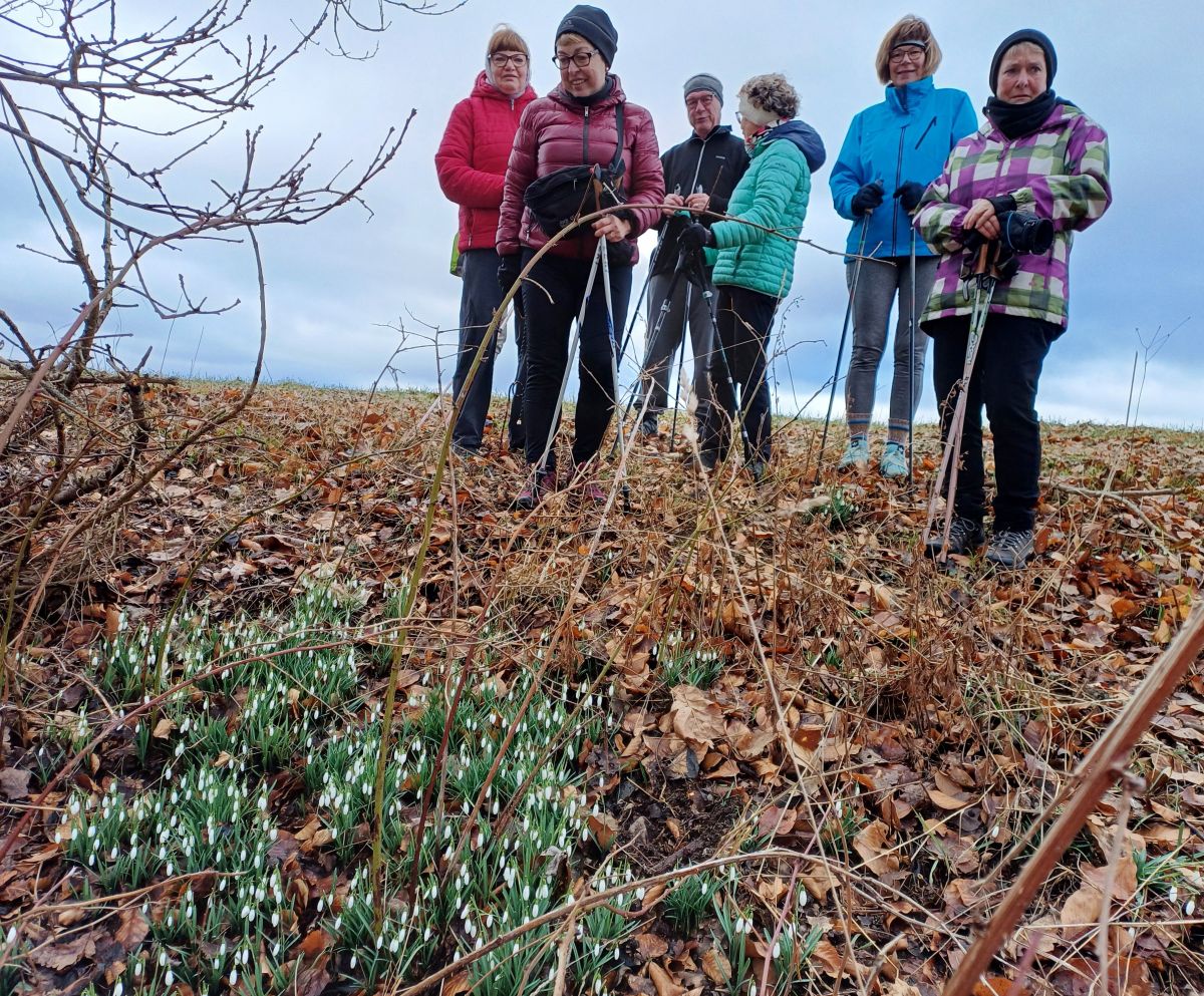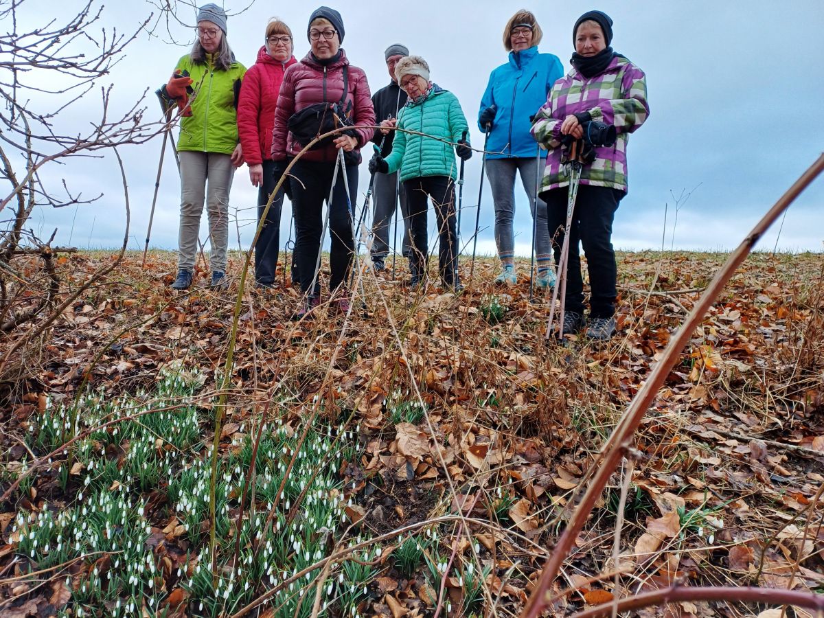 Am Ortsrand von Heßlach empfingen viele Schneeglöckchen die Nordic Walking Freunde.